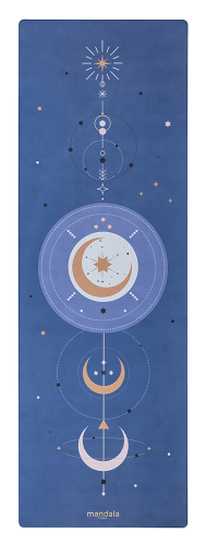 Antypoślizgowa mata do jogi z mikrofibry BLUE GALAXY ozdobiona księżycem, symbolizuje równowagę i transformację, inspirując do osiągania harmonii ciała, umysłu i ducha. Wyjątkowy wzór pomaga skupić się na ćwiczeniu.